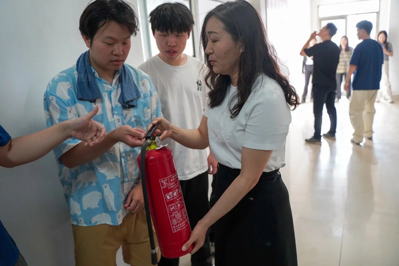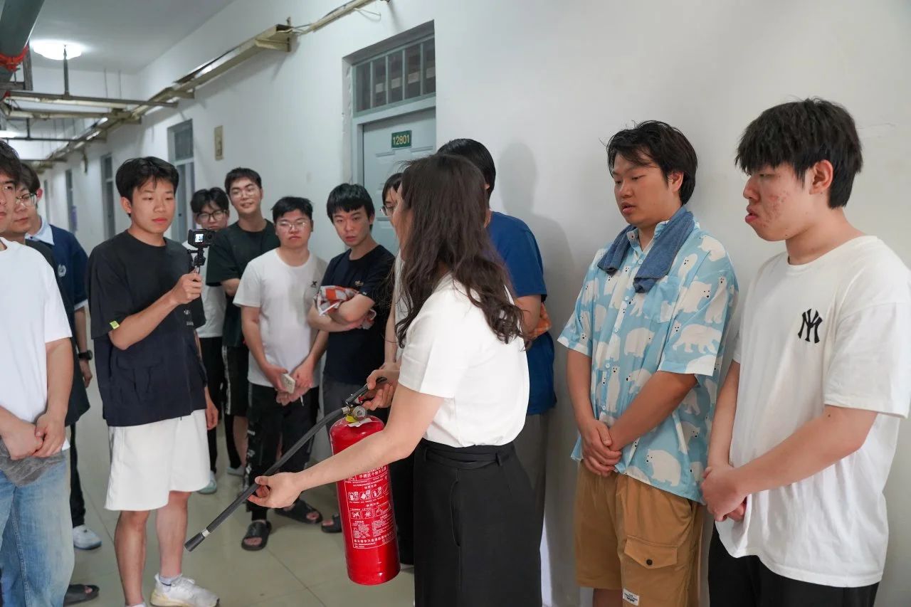 谢华老师采取“理论+实践”相结合的方式,通过讲解、案例分析、模拟演练等形式,系统介绍了火灾预防、初期火灾扑救、疏散逃生等关键技能。演练环节模拟真实火情,组织师生有序撤离。并现场演示灭火器,邀请同学实际操作,强化“一提、二拔、三握、四压”的灭火技巧,真正做到“学以致用”。