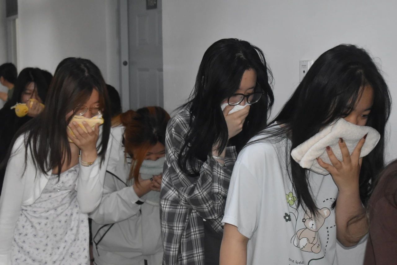 1、火情发现环节:由指定同学模拟发现火情,立即高声示警"着火了!大家快疏散!",同时通知相邻宿舍同学紧急撤离,并拨打校园110。
