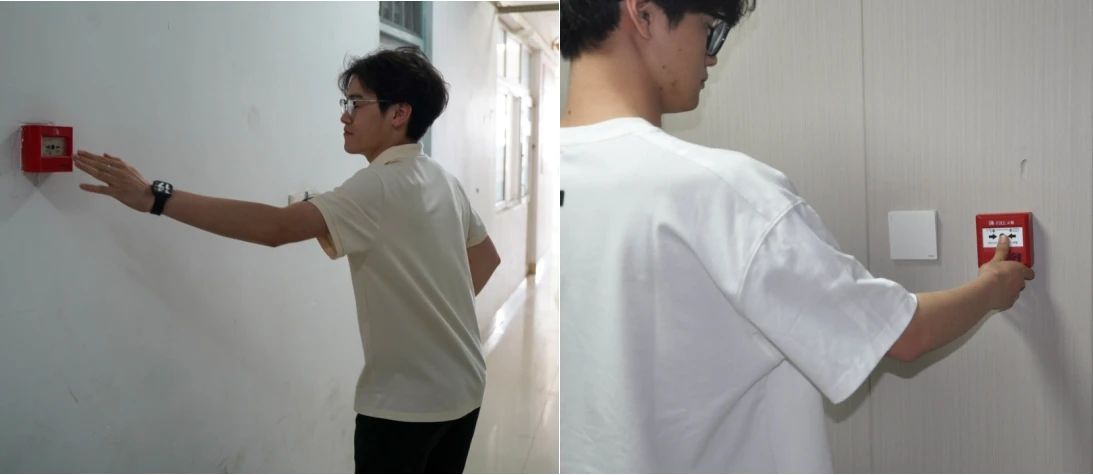 2、报警处置环节:紧接着同学迅速抵达最近的手动火灾报警按钮位置,规范完成报警操作。